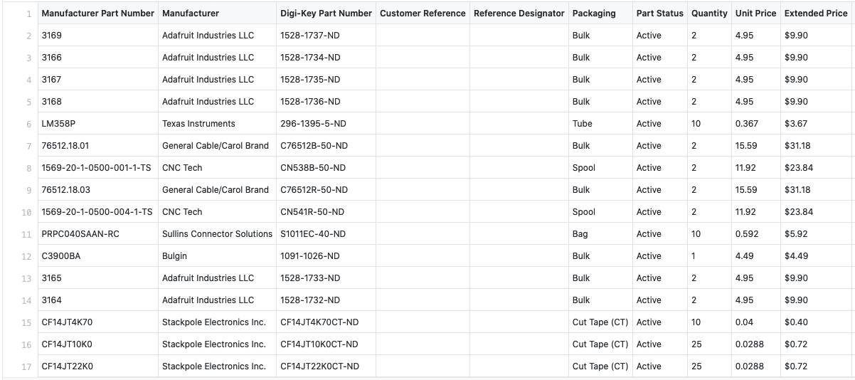 Production usually starts with the sourcing of material, and a bill of material (BOM) is required. It describes all the components and their references. If the component is to be purchased, one should find all the information required to buy the part. If the part is to be manufactured, one should find all the descriptions of the manufacturing instructions, as well as all the components needed for this manufacture (for instance, The BOM should report the amount of PLA needed when parts are 3D-printed).