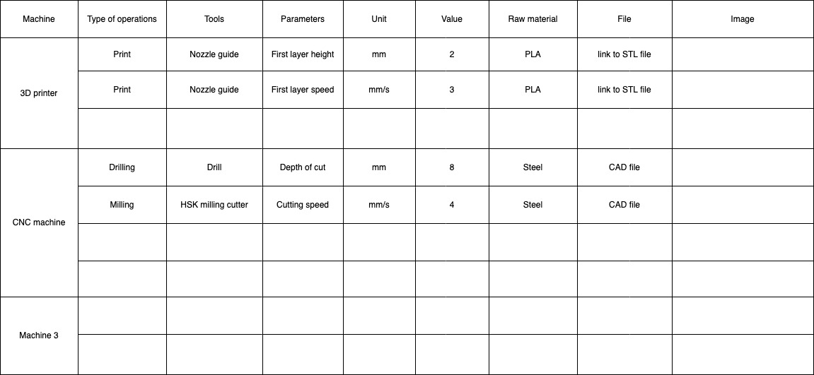 Describing step by step sequence of the machining process - Machine - Type of operation - Tools description - Process parameters of each machining operation